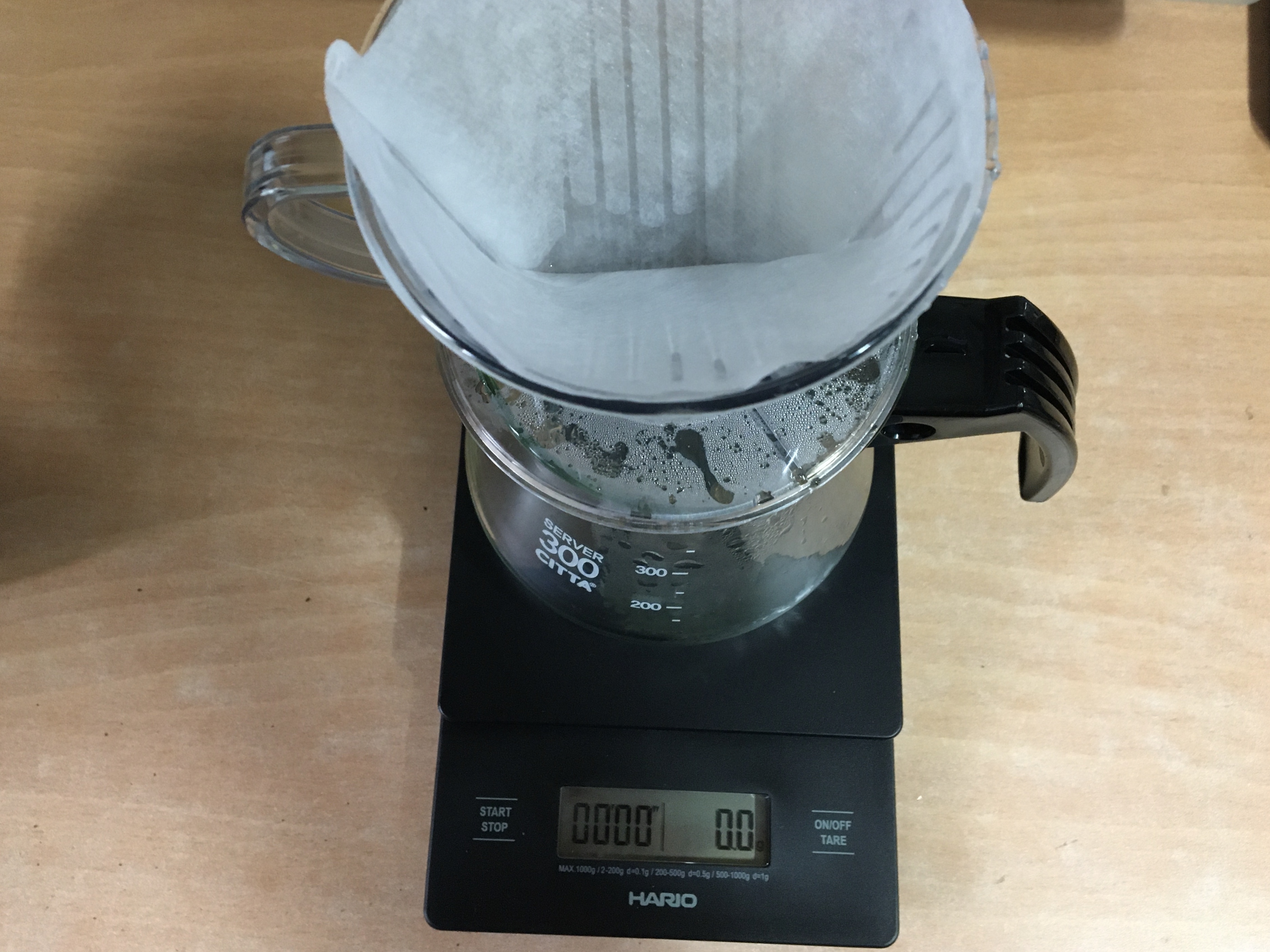 4. 드립용 저울에, 드리퍼와 서버를 놓고, 필터를 드리퍼에 끼운후 린싱해줍니다.