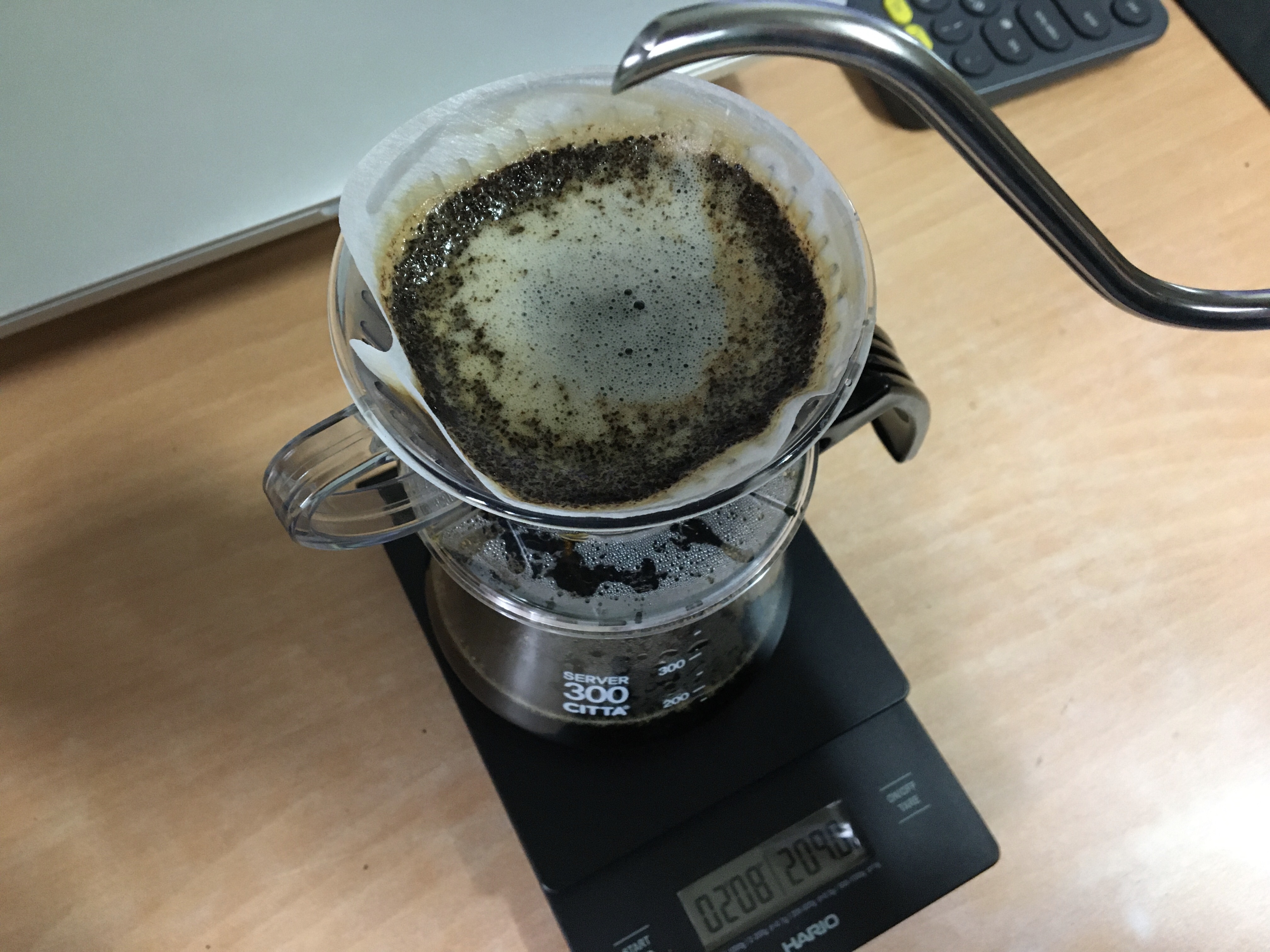 예를 들어 원두 20g 이면, 물을 280g~300g 내립니다.